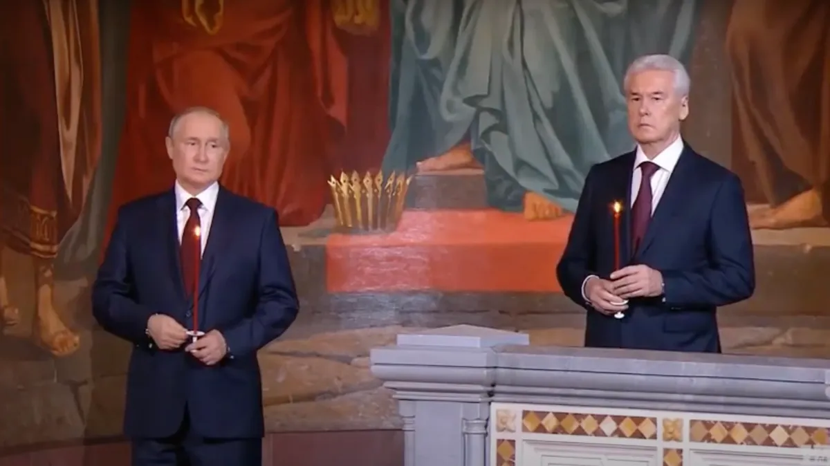 В честь Пасхи Путин и мэр Москвы Сергей Собянин посетили ночное богослужение в храме Христа Спасителя. Ранее в храм доставили частицу сошедшего в Иерусалиме Благодатного огня.
