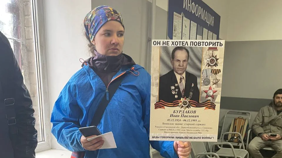 В Подмосковье на шествии «Бессмертного полка» задержали женщину с плакатом воевавшего родственника и лозунгом «Он не хотел повторить»