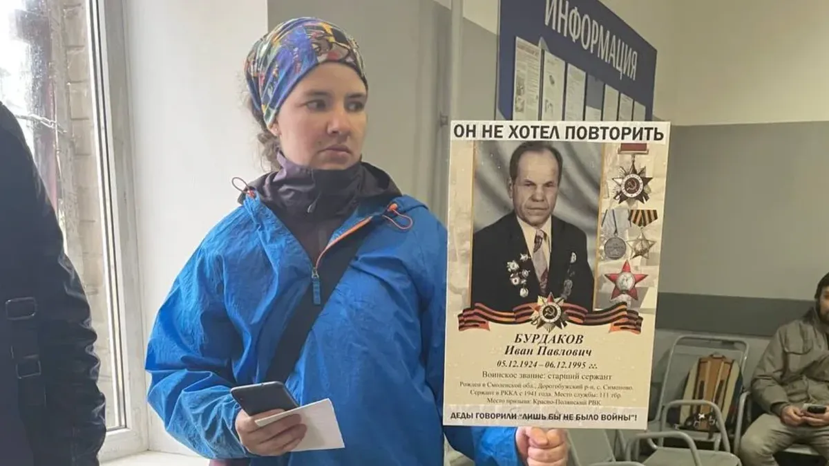 Woman carrying portrait of WWII veteran signed ‘He wouldn’t have wanted to do it again' detained near Moscow