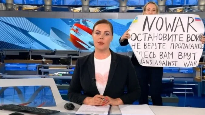 Итак, ничто не предвещало приезд в Киев Марины Овсянниковой, недавнего редактора российского Первого канала, ныне колумнистки немецкого издания Die Welt, уже награжденной Фондом прав человека премией имени Вацлава Гавела — за «креативное инакомыслие». В начале марта Овсянникова во время прямого, как утверждается, эфира программы «Время» вбежала в студию с плакатом на английском языке «Нет войне», послав сигнал таким образом россиянам: вам здесь врут. Позже женщина уволилась с канала, заплатила по суду штраф в 30.000 рублей и беспрепятственно покинула страну.