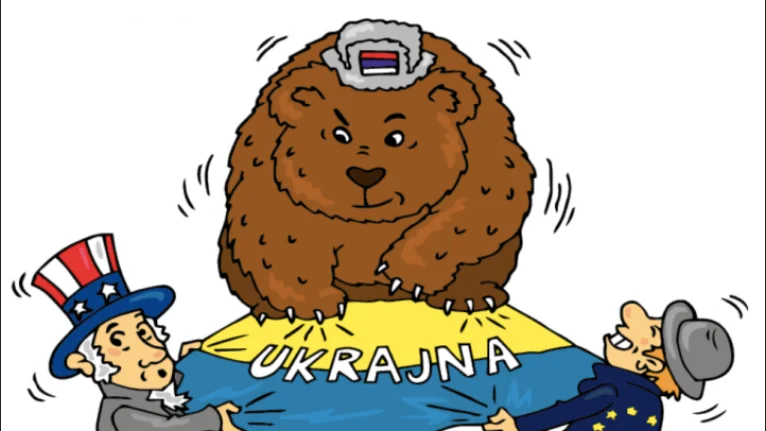Помимо этого, в учебнике есть иллюстрация, где Россия изображена в образе медведя, а ЕС и США — как разрывающие украинский флаг мужчины в шляпах.