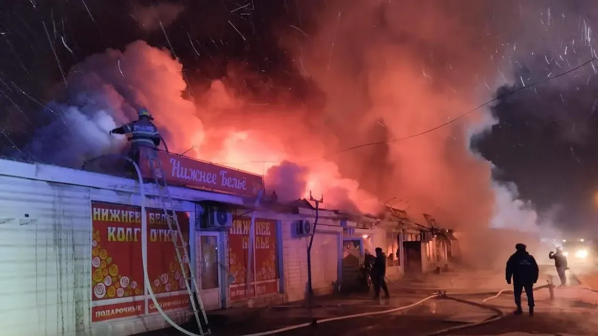 НовостиОбществоВ центре Минусинска загорелись торговые ряды1 декабря 2022, 15:38В торговых рядах в центре Минусинска в Красноярском крае произошел пожар. Об этом сообщили в региональном МЧС.Фото: МЧСПлощадь горения достигла 1200 квадратных метров. Примерно в 22:00 по местному времени (18:00 мск) пожар удалось локализовать.На данный момент на месте работают 48 человек и 18 единиц техники, рассказали в МЧС.По предварительным данным, пострадавших нет.