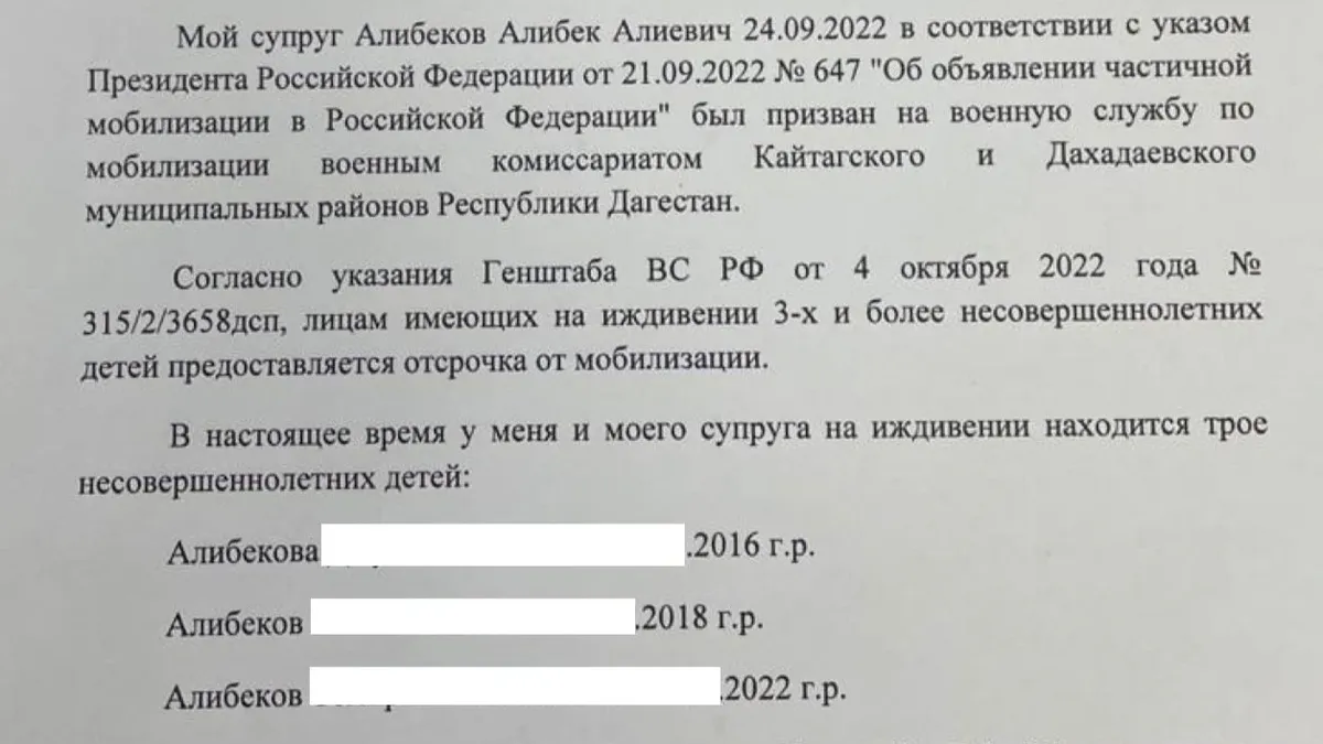 По данным правозащитника, 24-летний житель Дагестана Алибек Алибеков был призван по мобилизации 24 сентября. У него трое детей — 2016, 2018 и 2022 годов рождения.