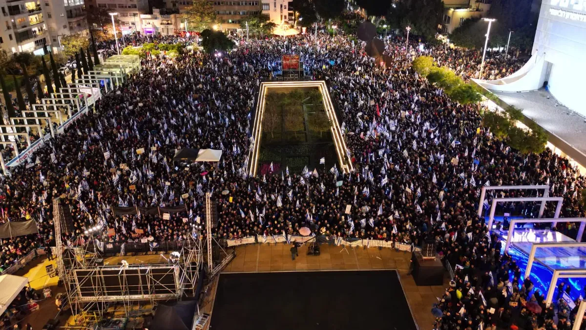 Десятки тысяч человек вышли на площадь Габима в Тель-Авиве, чтобы выразить протест новому правительство страны во главе с премьером-министром Биньямином Нетаньяху и его планам и внести изменения в судебную систему. Об этом сообщает The Times of Israel.