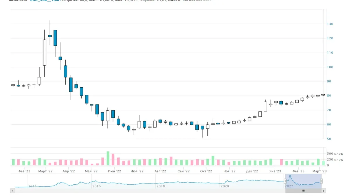 В последний раз евро торговалось выше отметки 81 рубль в конце апреля прошлого года.