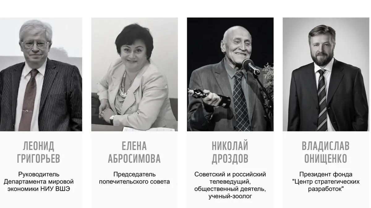 В попечительский совет, в частности, входят телеведущий Николай Дроздов, президент фонда «Центр стратегических разработок» Владислав Онищенко и руководитель Департамента мировой экономики НИУ ВШЭ Леонид Григорьев.