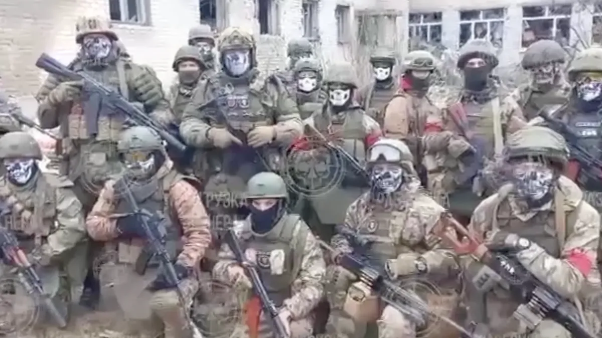 На видео — более 15 мужчин в военной форме, с оружием, в бронежилетах и касках. Их лица закрыты. На груди у некоторых из них можно заметить шевроны, напоминающие шевроны ЧВК «Вагнер».
