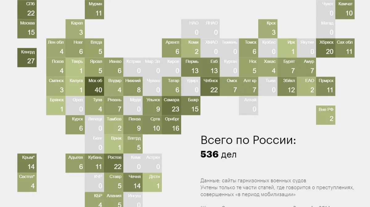 В гарнизонные суды по всей России поступили как минимум 536 дел по статьям о «самовольном оставлении части», «дезертирстве» и «неисполнении приказов», ужесточенным после начала мобилизации. Об этом сообщает «Медиазона».