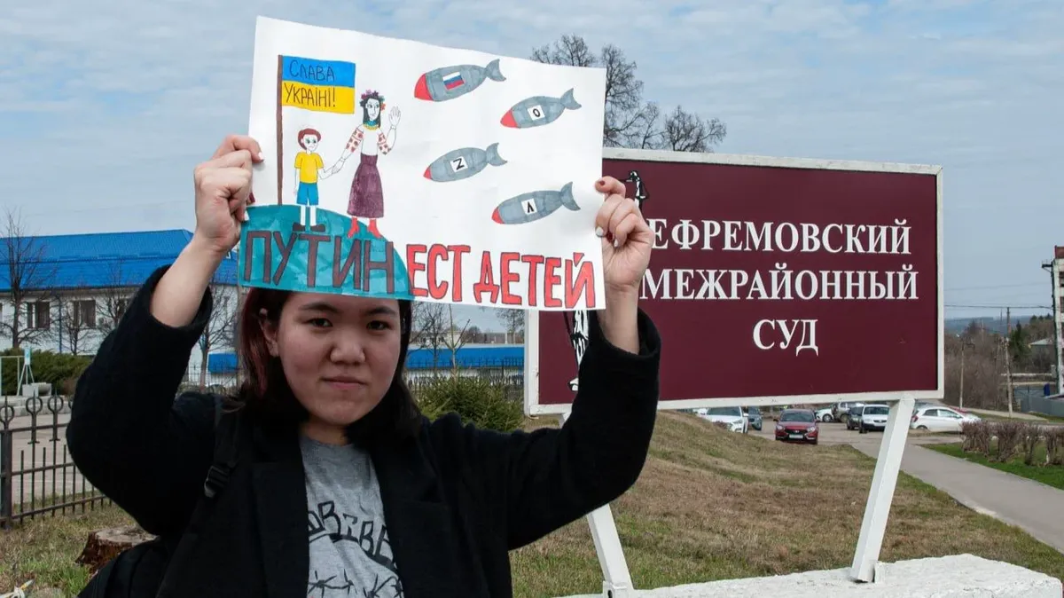 Как пишет правозащитное издание, девушка приехала из Петербурга на заседание по ограничению фигуранта «антивоенного дела» Алексея Москалева в родительских правах. Ее задержали у здания суда сразу восемь силовиков, пока она стояла с плакатом в виде детского рисунка с надписью «Путин ест детей».