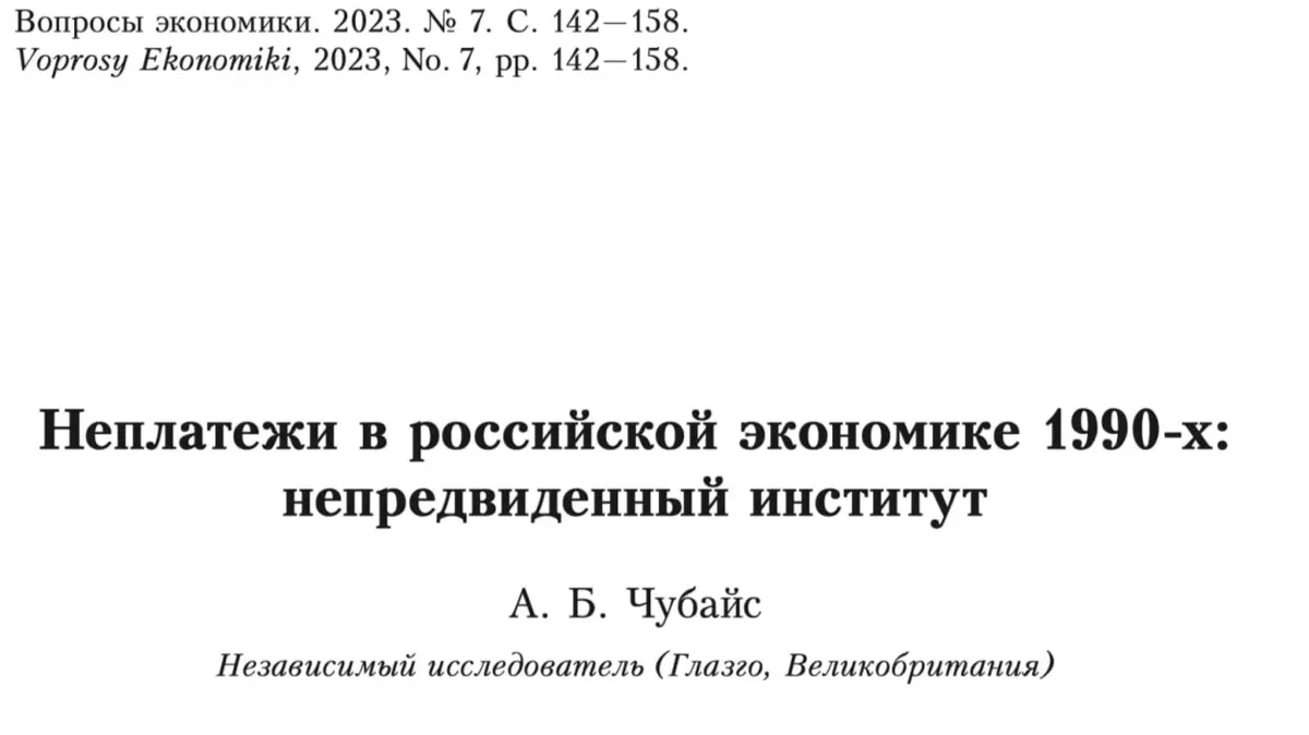 Работа под названием «Неплатежи в pоссийской экономике 1990-х: непредвиденный институт» появилась в седьмом выпуске журнала «Вопросы экономики». Журнал издается при поддержке Инстиута экономики РАН. Согласно аннотации, статья посвящена одному из крупномасштабных «процессов, нанесших наибольший ущерб экономике и населению России в 1990-е годы и ощутимо подорвавших престиж реформаторов».