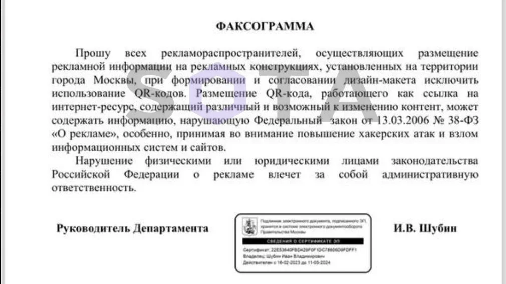 СМИ: правительство Москвы запретило использовать QR-коды на билбордах после того, как в городе появился баннер команды Навального