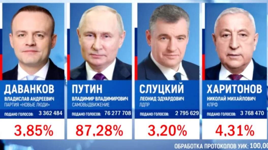 ЦИК: по результатам обработки 100% бюллетеней Путин набрал 87,28% голосов избирателей
