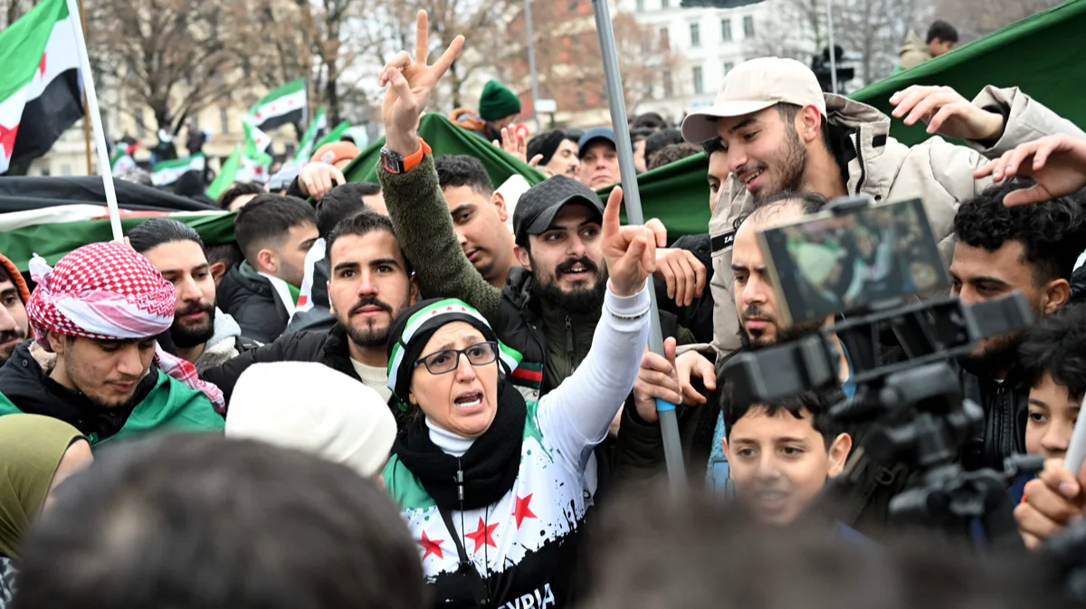 Члены сирийской общины размахивают сирийскими флагами на митинге в поддержку окончания режима Асада, Берлин, Германия, 8 декабря 2024 года. Фото: Ralf Hirschberger / AFP / Scanpix / LETA