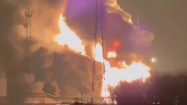 На горящей из-за попадания беспилотника нефтебазе в Краснодарском крае произошел взрыв. Пострадали двое пожарных