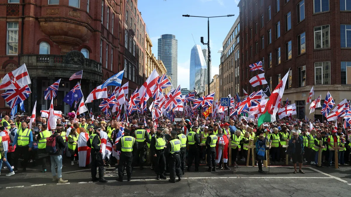 Толпа с английскими и британскими флагами требовала отставки правительства Кира Стармера и ограничения притока мигрантов. Перед протестующими выступили бывший советник Трампа Стив Бэннон, а также Илон Маск (по видеосвязи).