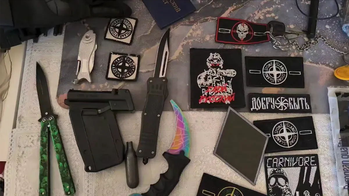 В ФСБ заявили, что в домах задержанных изъяли компоненты для взрывных устройств, холодное оружие, планы подготовки вооруженных нападений, нацистскую символику и «пропагандистские материалы украинских террористических структур».
