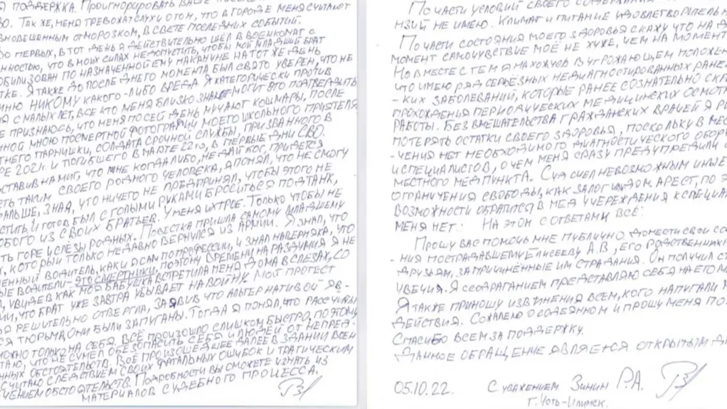 “I have nightmares to this day that [started] after I saw a post-mortem photo of my school mate, a 18-year old boy, conscript soldier; he was conscripted (for one year of compulsory military service — translator’s note) in November 2021 and was killed in March 2022, during the first days of the special military operation. After having imagined that I’d have to, God forbid, see my loved one [on a picture like that], I realised that I wouldn’t be able to go on living, knowing that I hadn’t done something to not let that happen,” Zinin writes.