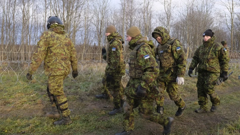 Estonian Defense Forces (EDF) reservists walk along a barbed wire barrier at the Estonian and Russian border during snap military exercise in Meremae, Estonia, 20 November 2021. Photo: EPA-EFE/VALDA KALNINA