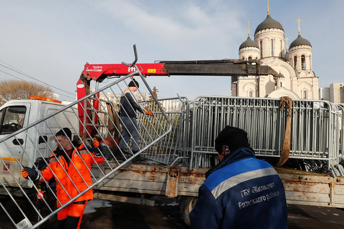 Накануне журналист Александр Плющев рассказал, что металлические ограждения начали также свозить к дому, где жил Навальный. Кроме этого «Медиазона пишет», что в окрестностях храма «Утоли моя печали» появились проблемы с работой мобильного интернета.