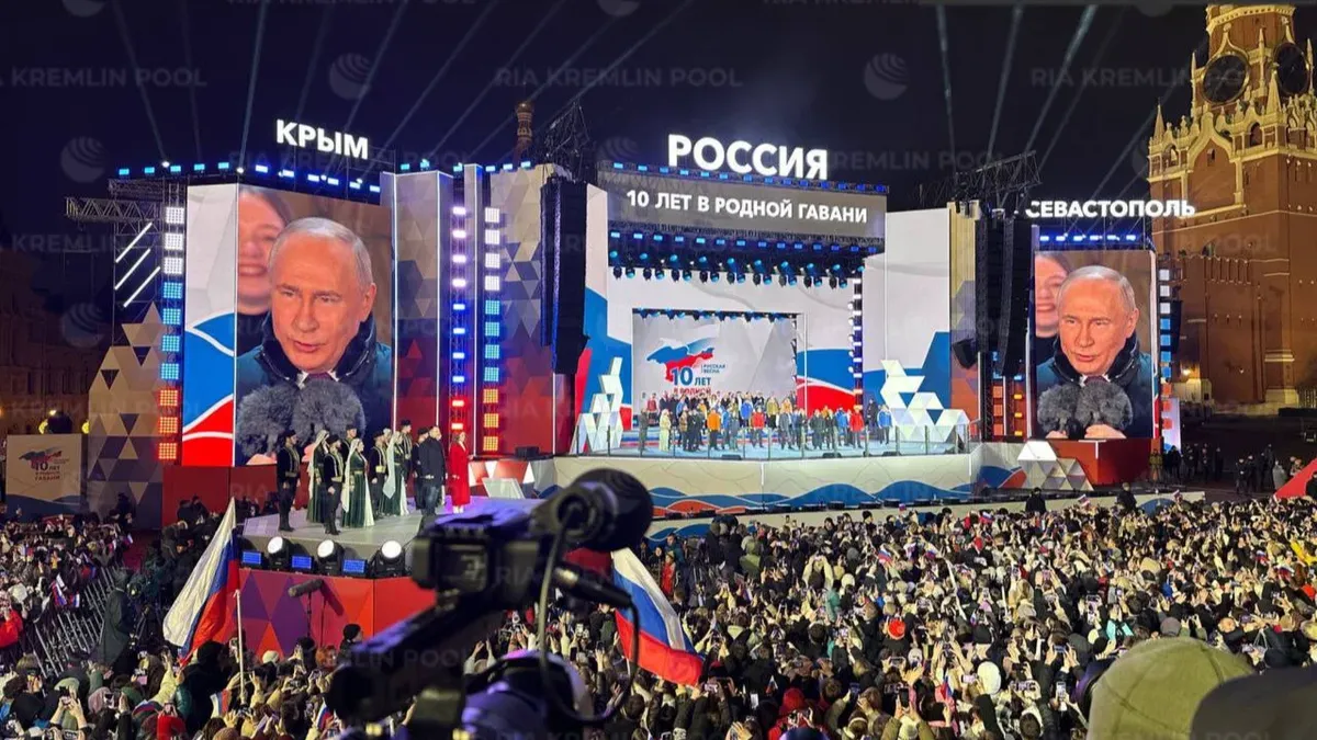 A buoyant Vladimir Putin addressed a crowd gathered on Moscow’s Red Square on Monday evening to commemorate the 10th anniversary of Russia’s illegal annexation of Crimea.