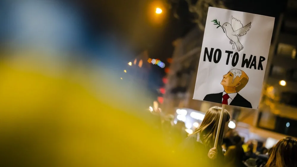 A woman holds a sign reading 'no to war' during a demonstration against the Russian invasion of Ukraine in Bern, Switzerland, 03 March 2022. Photo: EPA-EFE/MICHAEL BUHOLZER