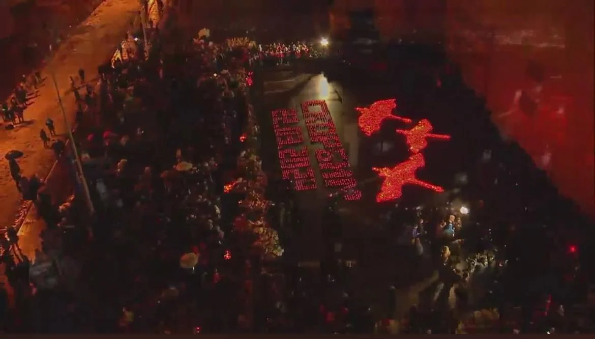 Вечером 24 марта люди зажгли сотни свечей у здания «Крокуса» и выстроили из них надпись «Скорбим. 22.03.2024», а на стенах здания появилась проекция летящих журавлей.