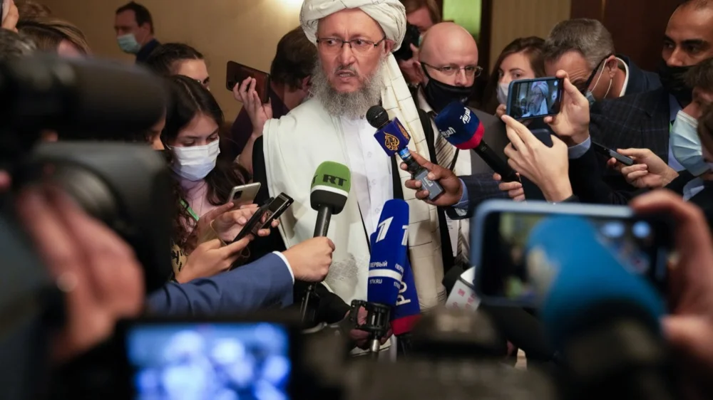 Taliban official Abdul Salam Hanafi speaks to media during talks involving Afghan representatives in Moscow, Russia, 20 October 2021. Photo: EPA-EFE/ALEXANDER ZEMLIANICHENKO / POOL