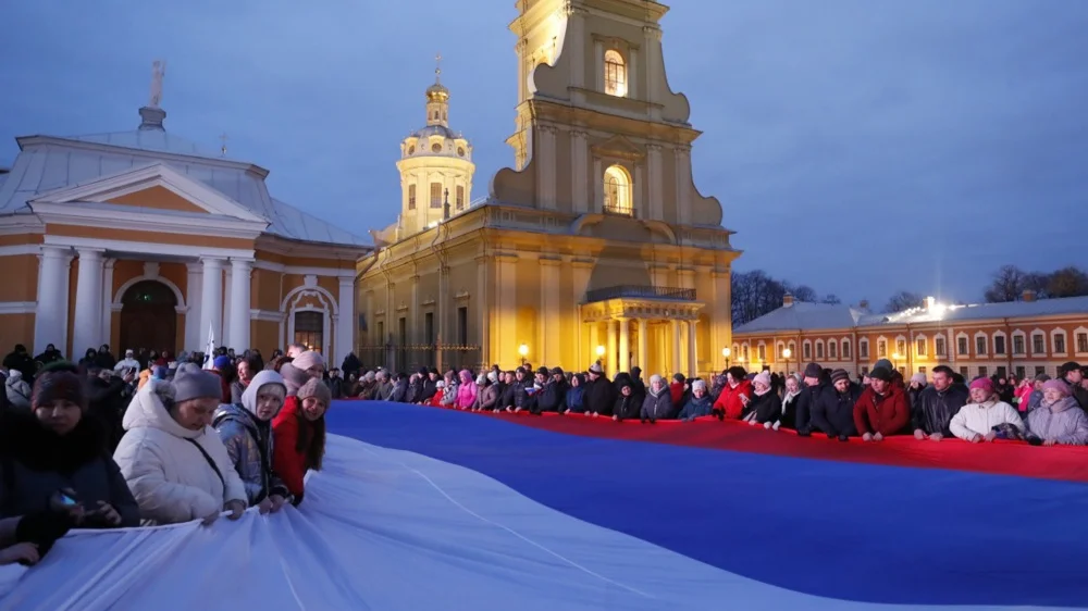 People hold a large Russian National flag during the celebration of the tenth anniversary of Russia's annexation of Crimea, in St. Petersburg, Russia, 18 March 2024. Photo: EPA-EFE/ANATOLY MALTSEV