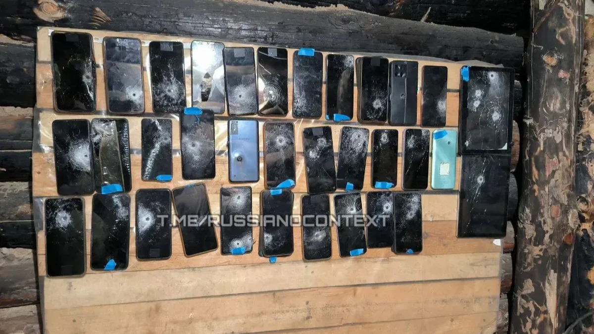 Destroyed phones belonging to Russian soldiers fighting in Ukraine. Photo: Russia no context / Telegram