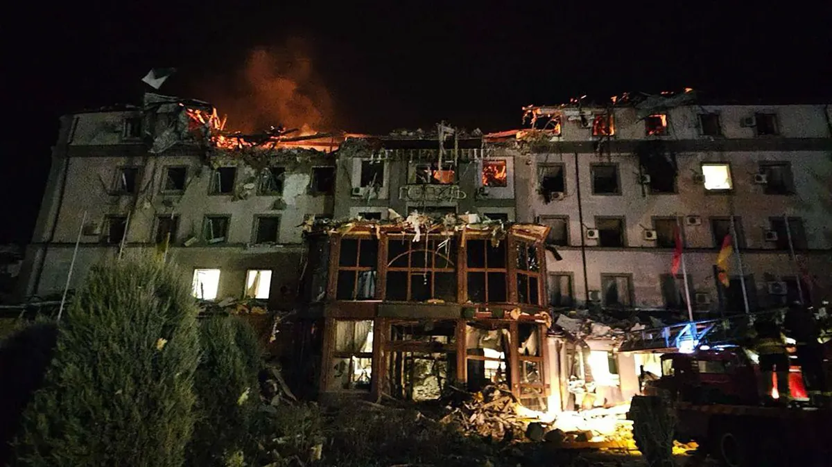 According to Lysak, a fire broke out after the strike on the hotel late on Wednesday night, with 14 apartment blocks, 12 shops, a post office, a cultural centre and multiple cars also damaged in the blast.