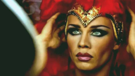 Artist Anatoly Yevdokimov is seen putting on make-up and a wig and carrying out a drag performance in a night club setting in the video to the 2002 pop song On Tebya Tseluet (“He Kisses You”).
